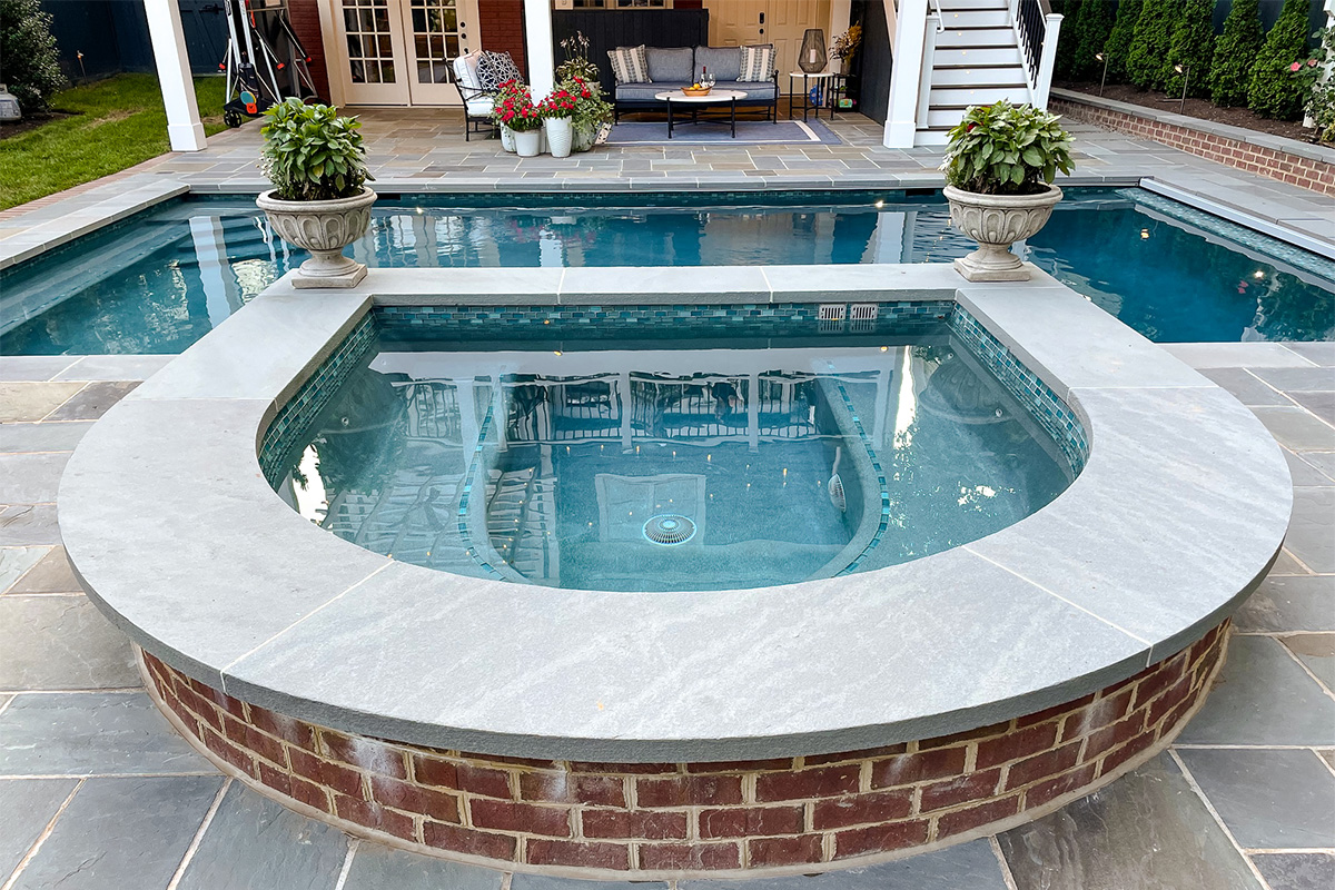 Rossen Landscape delivered a cohesive design/build experience, integrating clean architectural lines with layered plantings and intimate outdoor zones. At the heart of the space is a stunning custom pool and raised spa, wrapped in natural stone and detailed with brick banding for textural interest. The spa’s elevated structure not only provides a focal point but creates a soft auditory backdrop with its spillway into the pool.