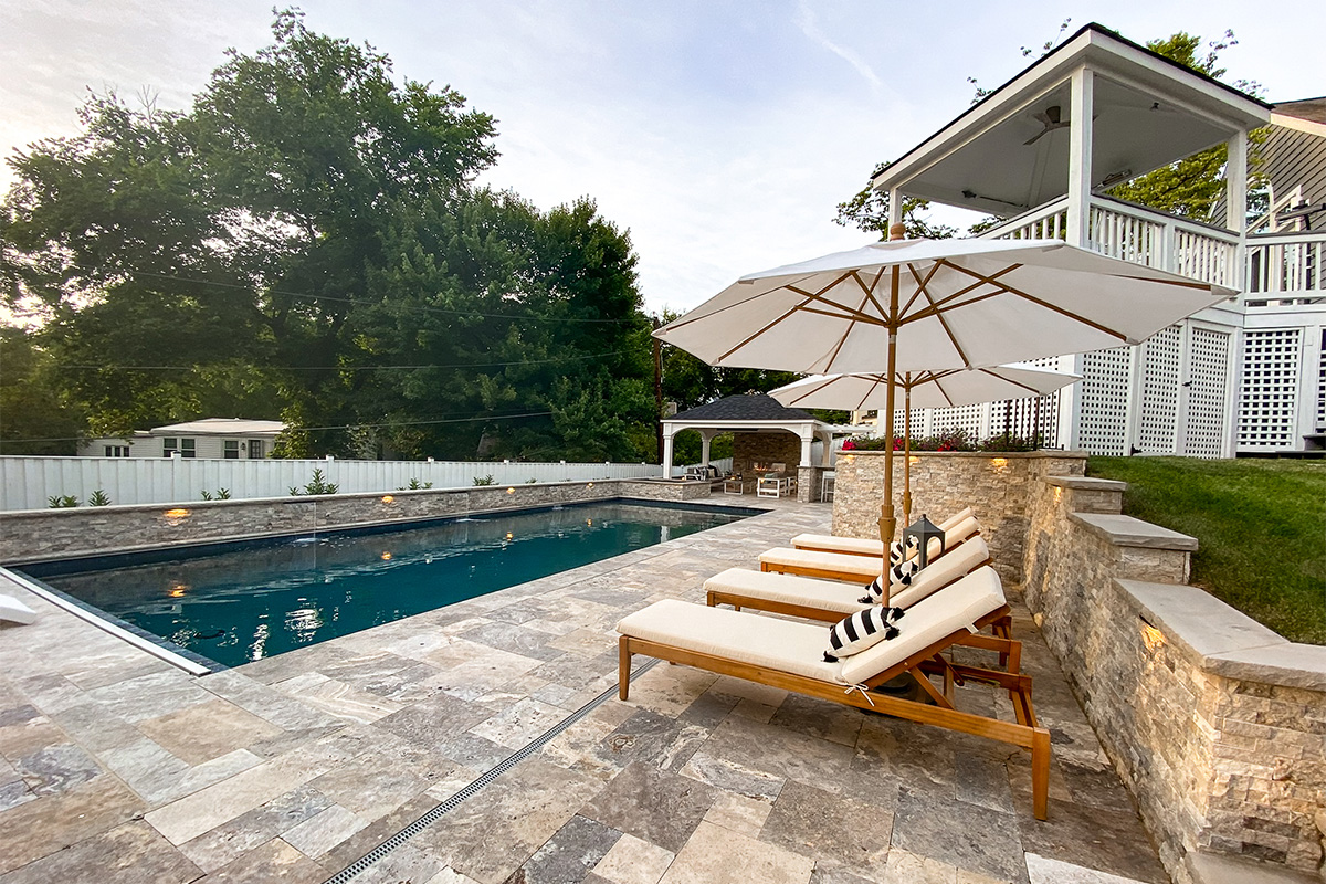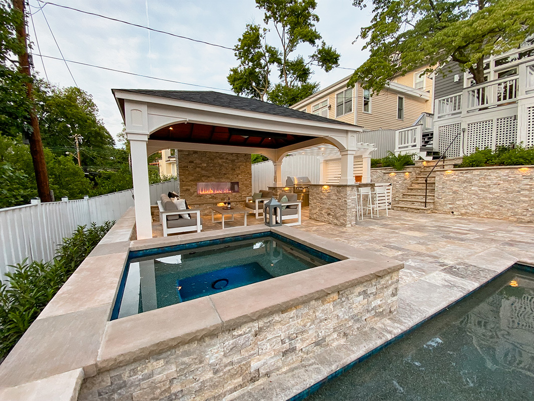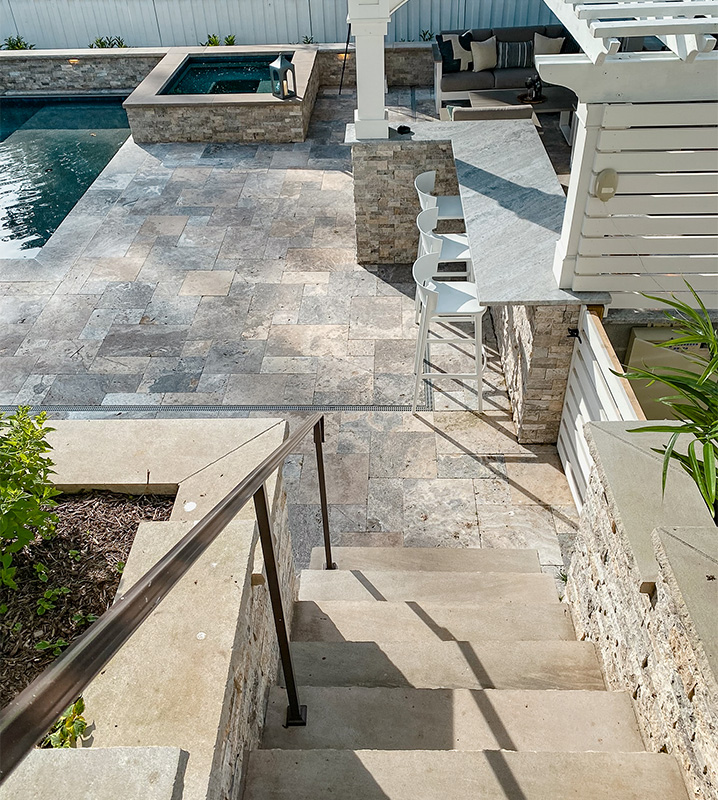 Bordered by a travertine patio spanning 970 square feet, the pool area is designed for seamless movement and barefoot comfort. Integrated into the pool wall is a linear water feature – adding visual motion, ambient sound, and nighttime glow to the entire space.