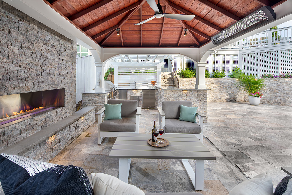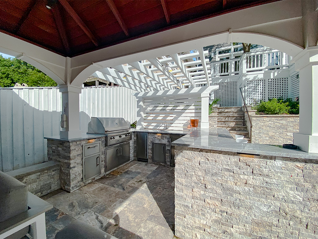 Beneath its refined shelter, a fully equipped outdoor kitchen includes a grill, sink, undercounter storage, and a bar counter ideal for everything from weeknight meals to weekend celebrations. A sleek pergola extends from the structure, defining the adjacent patio with open-air elegance and dappled light.